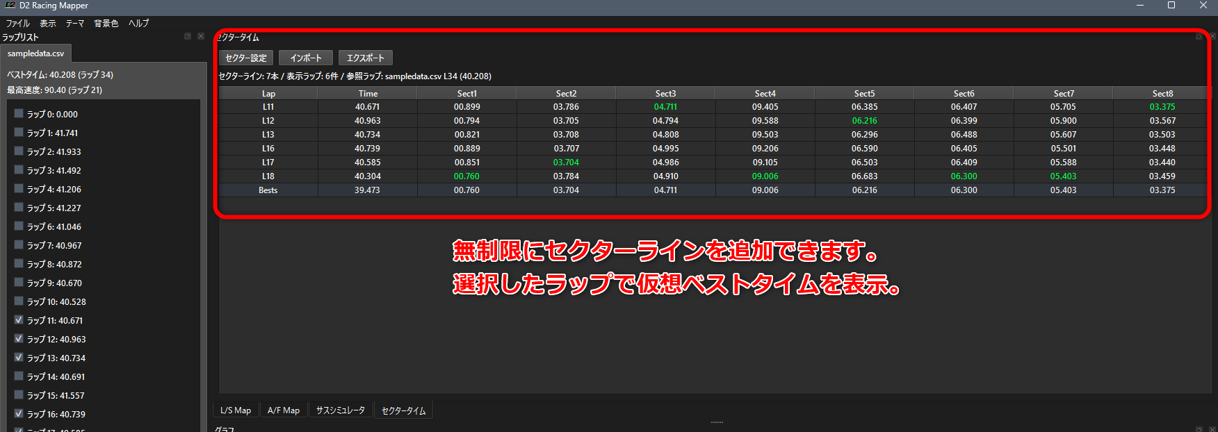 D2 Racing Mapperは、Droggerで記録した走行データをPC上で詳細に分析・視覚化を行うツールです。